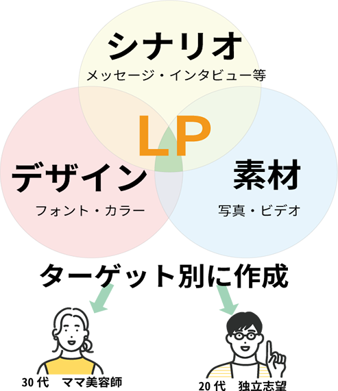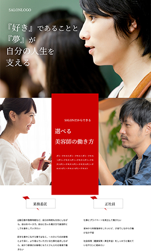弊社では、採用LP制作にあたり、ヒアリングを実施しております。 ヒアリング内容はサロン情報、募集要項から始まり、求める人材像・求職者の将来設計まで多岐にわたります。 たとえば、フルタイムでバリバリ働き、将来独立を視野に入れている未婚の男性スタイリストと、子供がいて時短で働きたい主婦パートの2人の求職者がいた場合、これから就職するサロンに求める条件は異なったものになるのは想像いただけると思います。 それぞれの求職者では採用LPのシナリオ構成も大きく異なります。