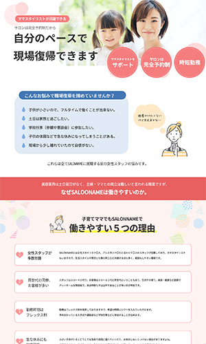 美容師1人の採用に100万円以上もかかるケースも多くありますが、採用LPの場合、御社のホームぺージサーバーにLPを設置いたしますので、必要な時に広告を出稿できるため余計なコストをかけることはありません。また、サロンホームぺージからのリンクも設定しやすくなります。